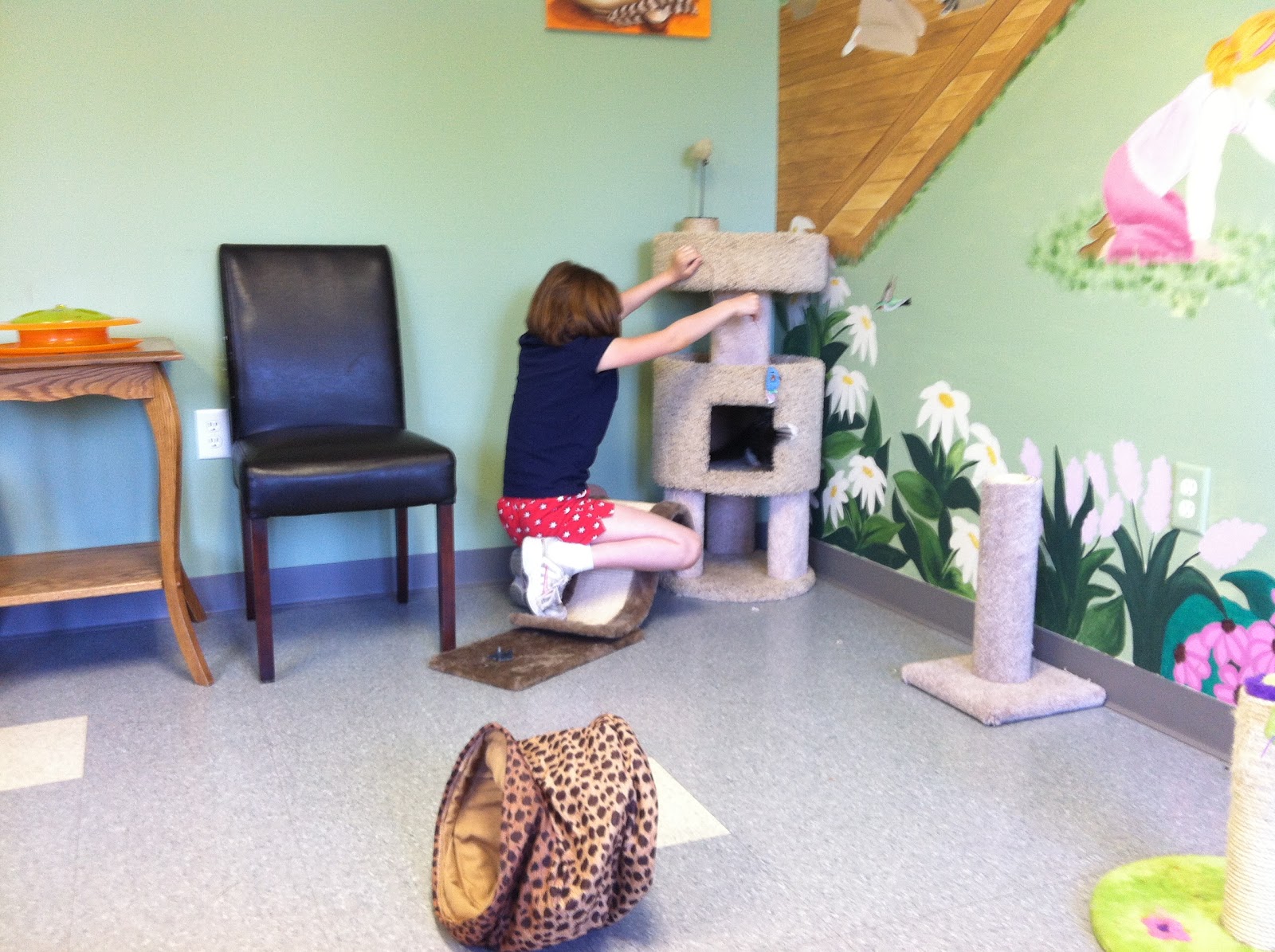 This began a two and a half week period of visits to Mittens the inpatient - I'd pick Kiddo up at dismissal on school days and we'd trek over to the animal hospital, and on the weekends we'd head over as soon as we'd finished breakfast. The staff would let us have a room (at first, one of the exam rooms, but then they let us use the shelter's adoption visit room instead, which was large, full of cat toys and had seating for humans) and we'd spend an hour or two (or three) with Mittens. Kiddo would bring her favorite toy from home and would play with her and snuggle her.