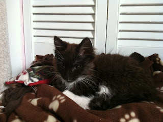 The following week, I had to bring Socks to the vet for her spaying surgery. (This is a condition for adopting from the shelter.) Kiddo was understandably nervous, but the next day, we picked Socks up and she came home with a shaved belly but otherwise no worse for the wear. (She also was the first cat I've ever had - and I've had dozens - who actually liked taking medicine. Then again, she is one of those "OMG it has been FOREVER since I've had any food and I'm STARVING - FEED ME NOW!!!!!" kinds of kitties, so perhaps the medicine was just another kind of "food" in her opinion.) When I went to drop Socks off (without Kiddo in tow), I inquired about Mittens. I feared the worst - to learn that she'd been put down - and was happily surprised to hear that she was once again improving and might even be cleared for adoption again. !!! I shared that news with Hubby and that night, we decided that if Mittens was made available for adoption, we would adopt her again. We were prepared to have a special needs kitty, after all, we have a special needs kid. I let them know the next morning that we wanted Mittens, and over the next week we kept in touch with the staff, hearing nothing but cautiously optimistic news.